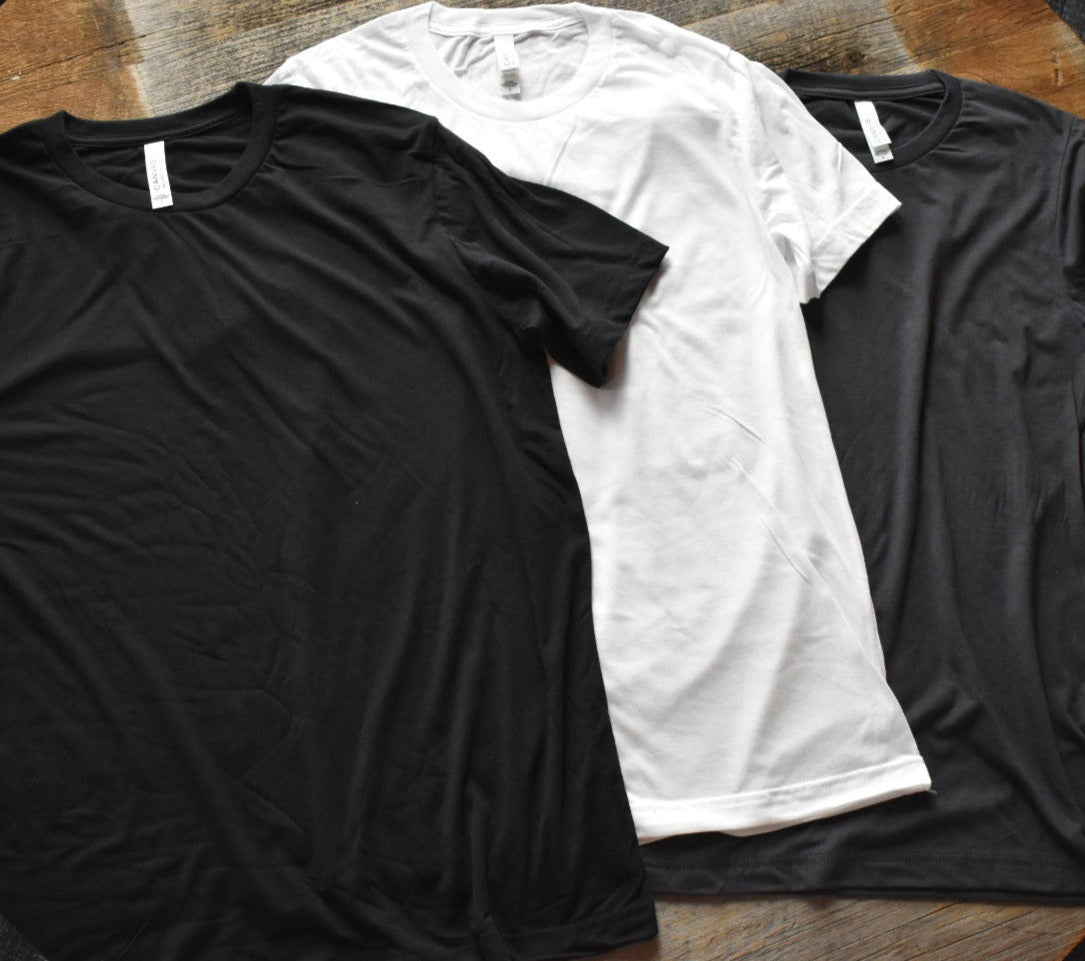 Black Heather Triblend: 70% combed ring-spun cotton, 15% polyester, 15% rayon