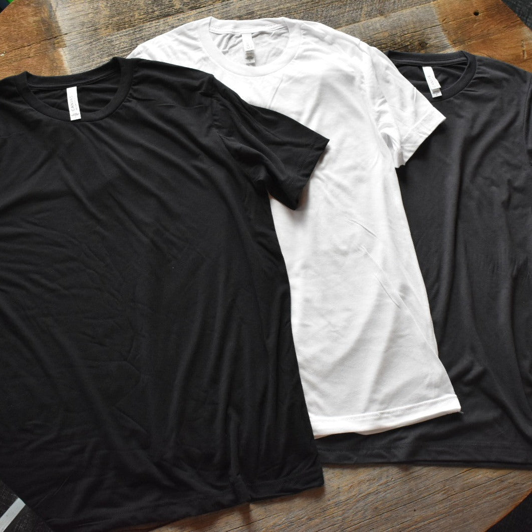 Black Heather Triblend: 70% combed ring-spun cotton, 15% polyester, 15% rayon