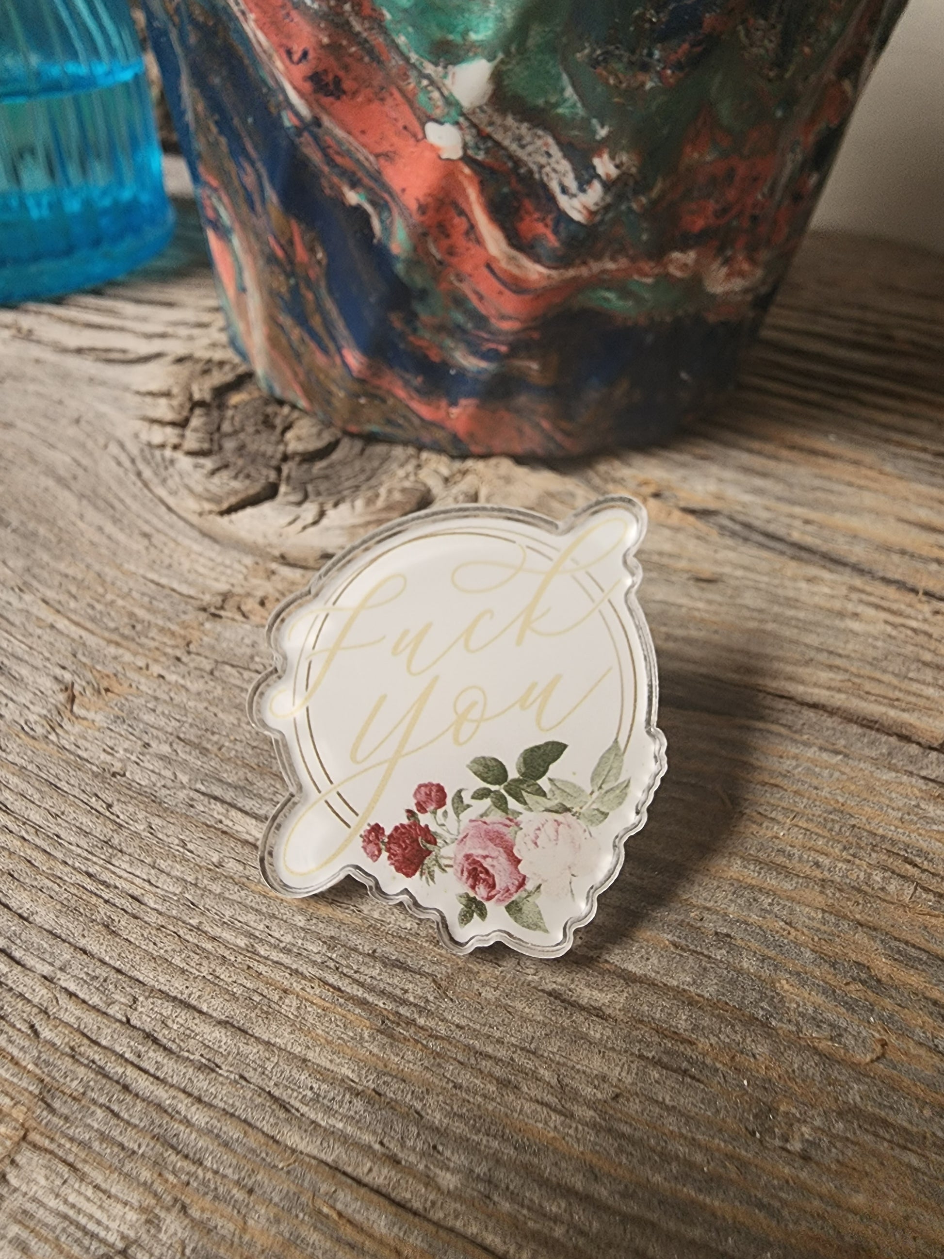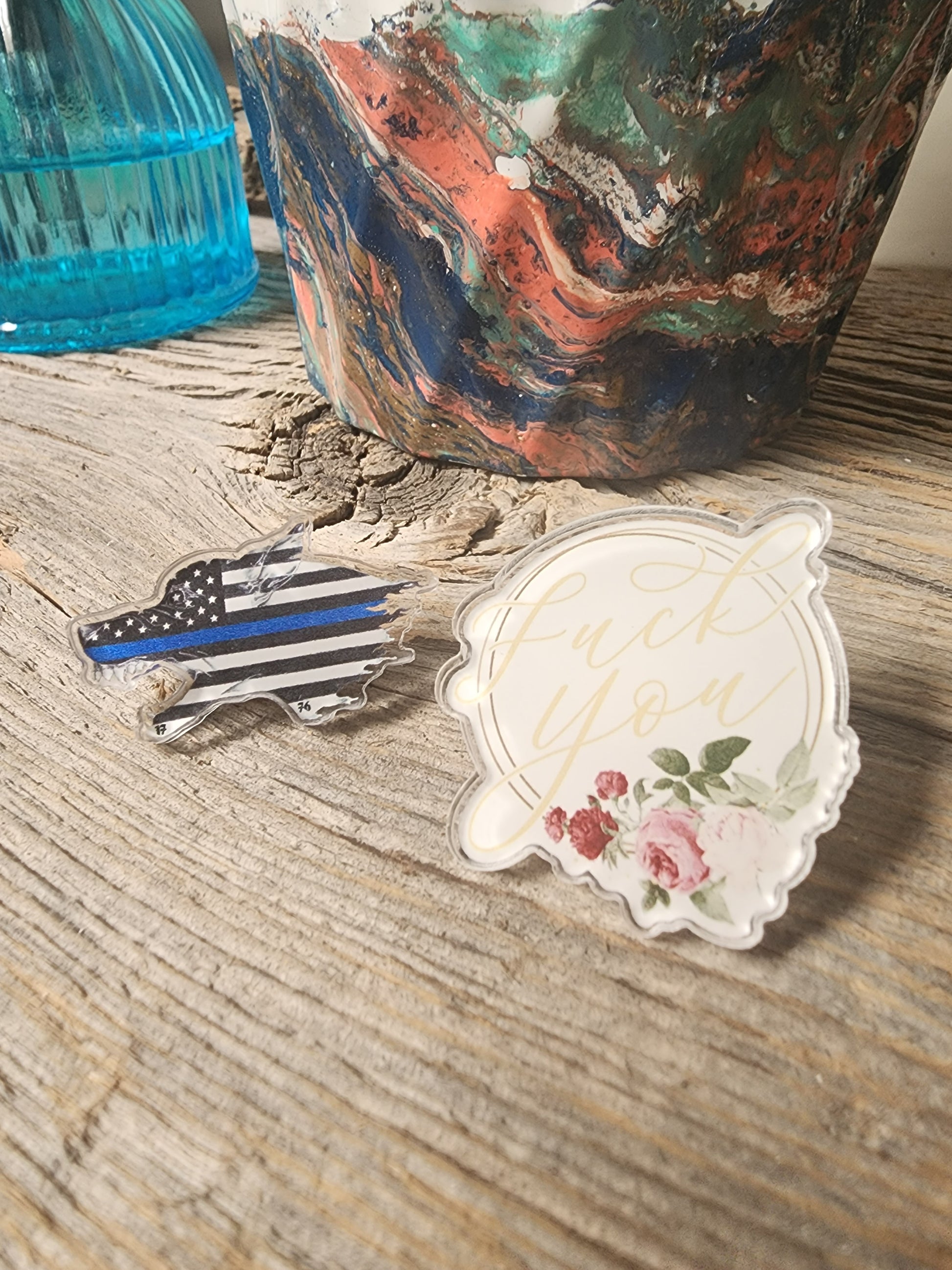 Durable acrylic pins. Each pin features a durable, rubber clutch, allowing you to fasten your pin to your clothes, backpack, or accessories.