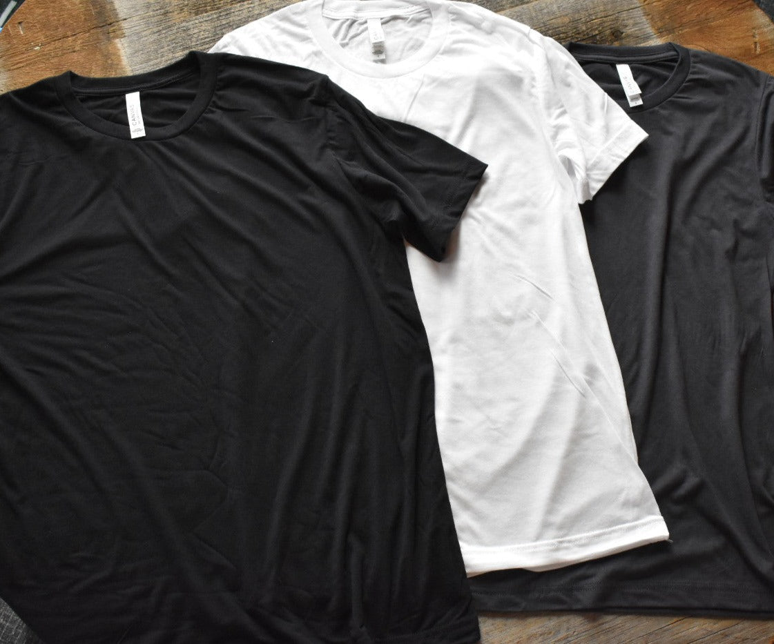 • Black Heather Triblend: 70% combed ring-spun cotton, 15% polyester, 15% rayon