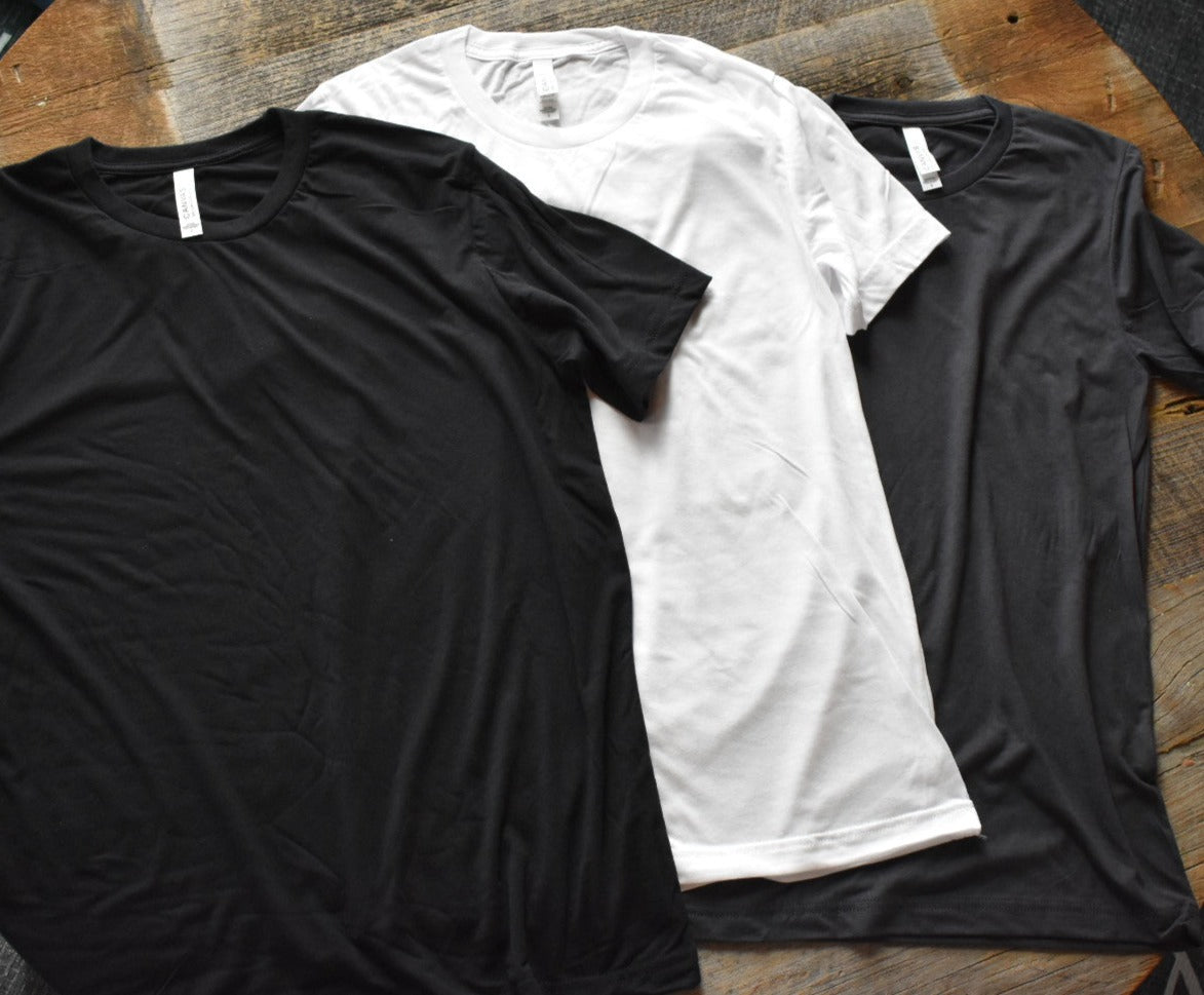 Black Heather Triblend: 70% combed ring-spun cotton, 15% polyester, 15% rayon